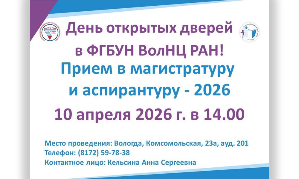Приглашаем Вас на День открытых дверей в Вологодский научный центр! В программе мероприятия: знакомство с научными подразделениями, информация о приеме в магистратуру и аспирантуру. Ждем всех, кто хочет узнать больше и сделать первый шаг навстречу новым знаниям и возможностям!